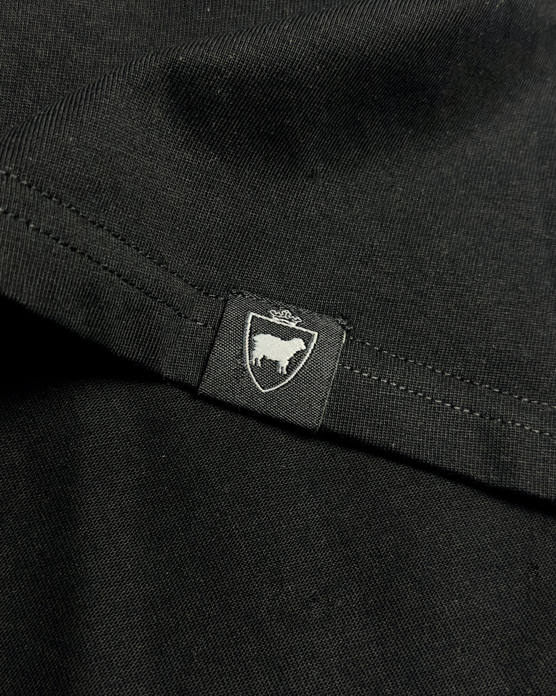 This tee features a ribbed crewneck collar and our Family Crest logo tag on the front hem. This is printed with our script Statement graphic wide across the back from shoulder to shoulder and small on the front chest.