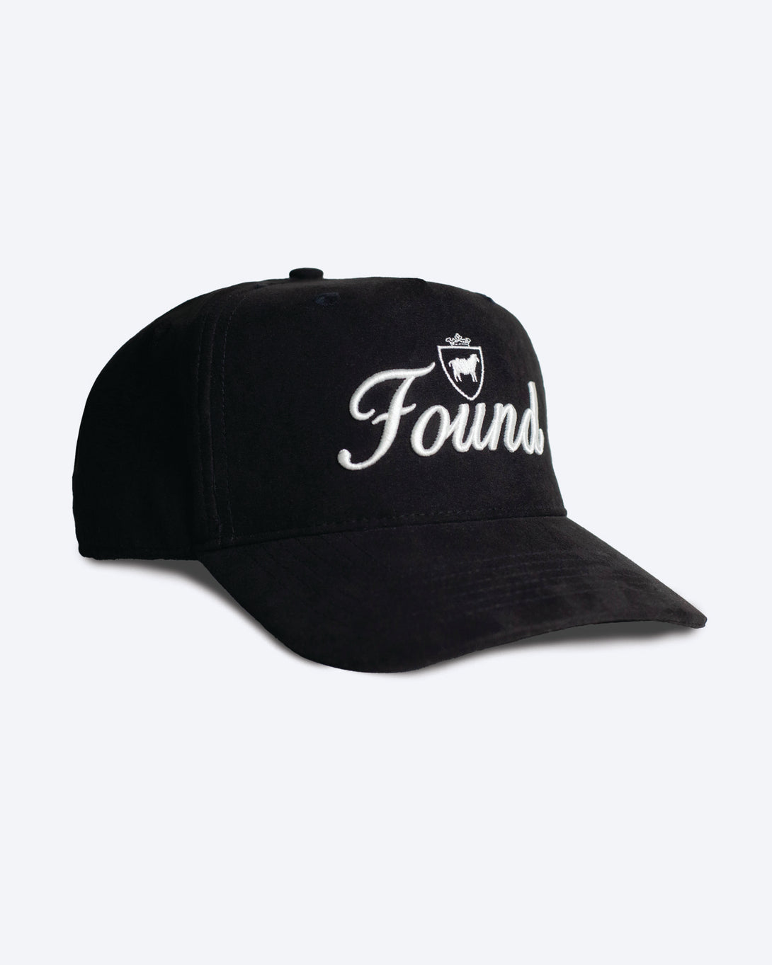 Introducing the Found cap in black, a high build frame cap crafted in luxurious velvet with and embroidered front.